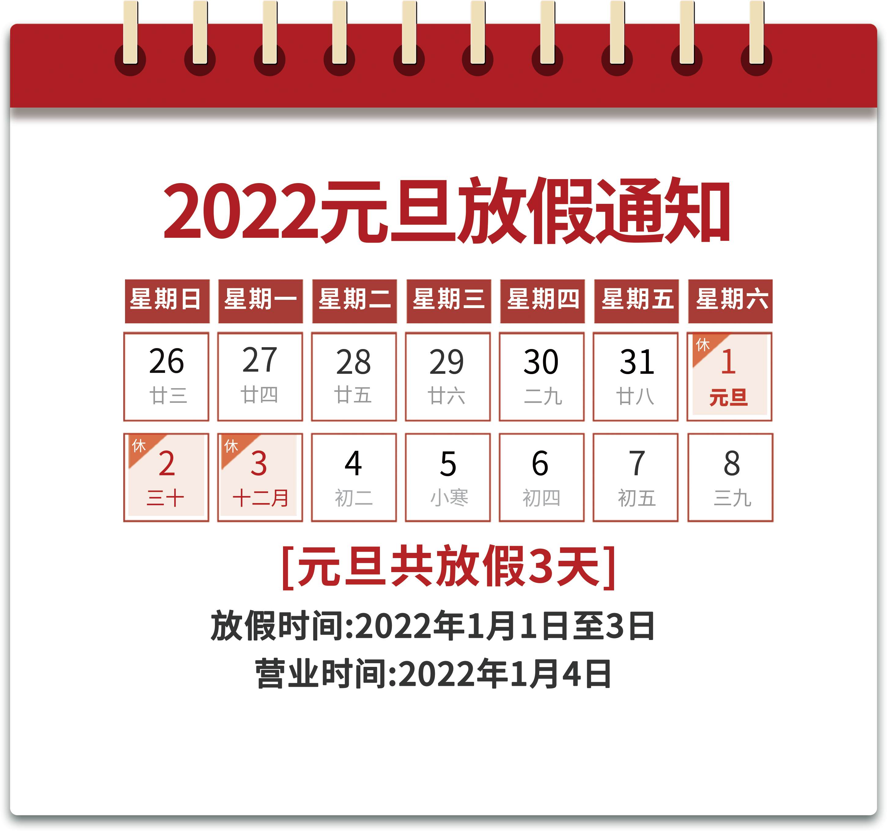 根据《国务院办公厅关于2022年节假日安排的通知》,结合我司实际情况与工作安排,经研究决定2022年元旦节放假安排如下:元旦2022年1月1日至2022年1月3日放假,共3天;1月4日(星期二)正常上班。