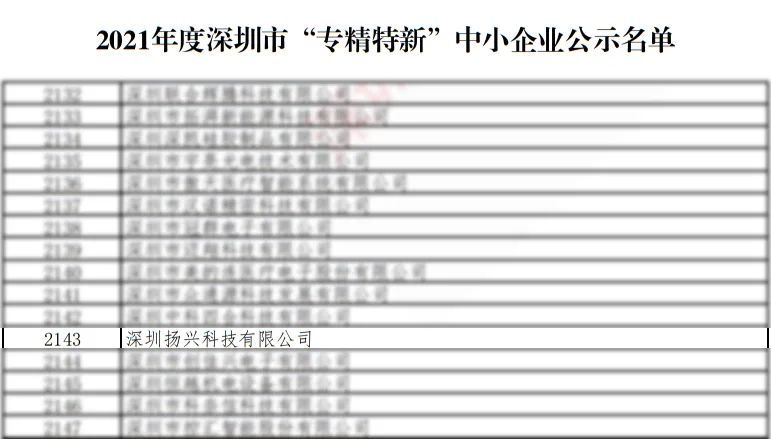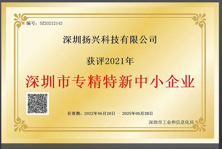 近日,深圳扬兴科技有限公司成功入选工信局2021年度深圳市专精特新中小企业名单,获评“专精特新”荣誉称号。