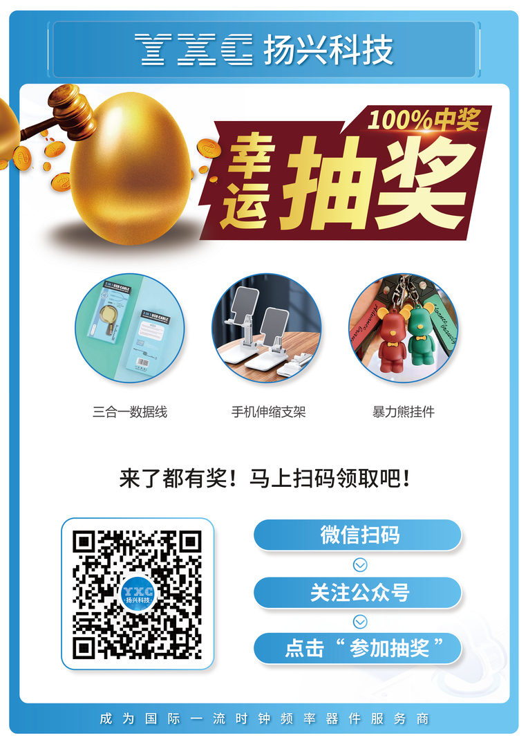 为了感谢您的支持与厚爱,我们还特别为本次展会准备了精彩纷呈的抽奖活动!现场参与抽奖,将有机会赢得扬兴科技提供的丰厚奖品。更有惊喜大奖等您来拿!