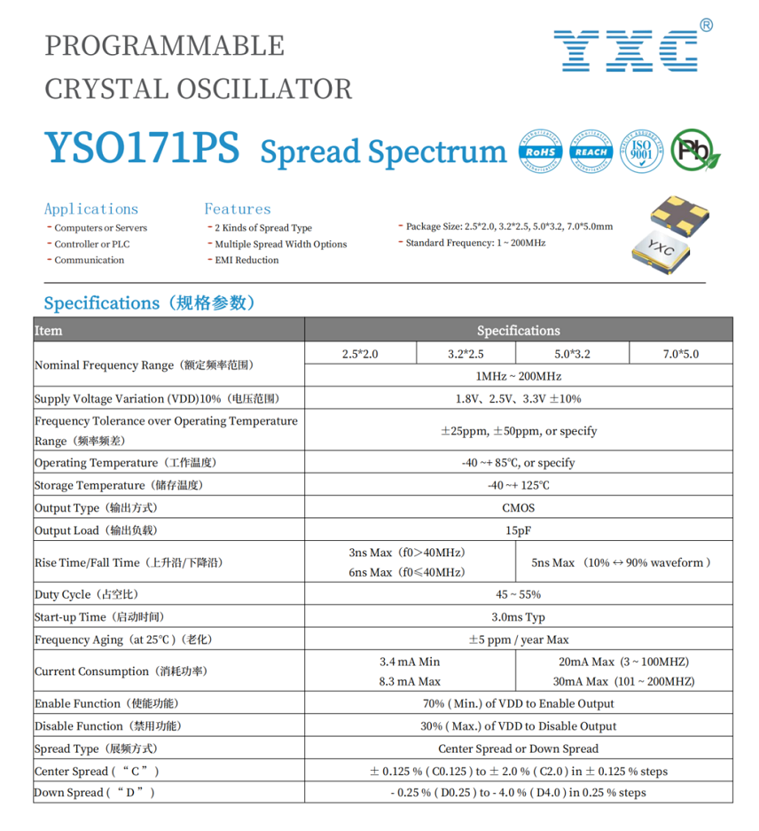 YXC晶振特别推出可编程展频振荡器YSO171PS系列: