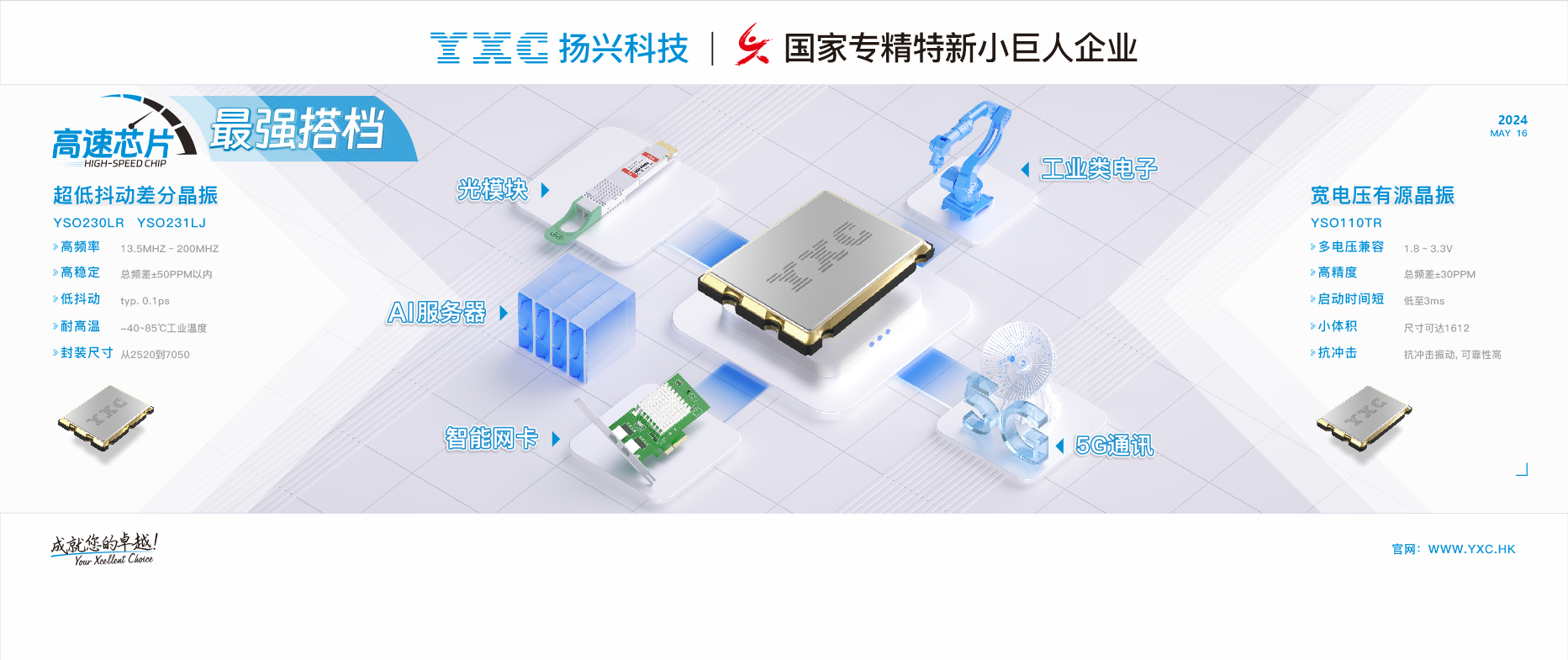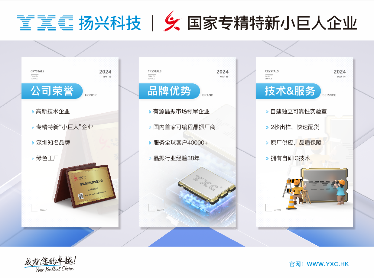 扬兴科技(YXC)专注晶振已38年,我们拥有先进的测试仪器和经验丰富的销售技术团队,专注于可编程晶振、石英振荡器、石英晶体谐振器、时钟晶振、陶瓷谐振器、TCXO温补晶振等系列产品的研发与生产。扬兴科技的晶振产品广泛应用于光模块、智能网卡、5G通信、AI服务器、3C数码、智能家居、ADAS、车载影音、医疗、工业控制等众多领域,为社会各行各业的智能化发展提供了坚实的支撑。