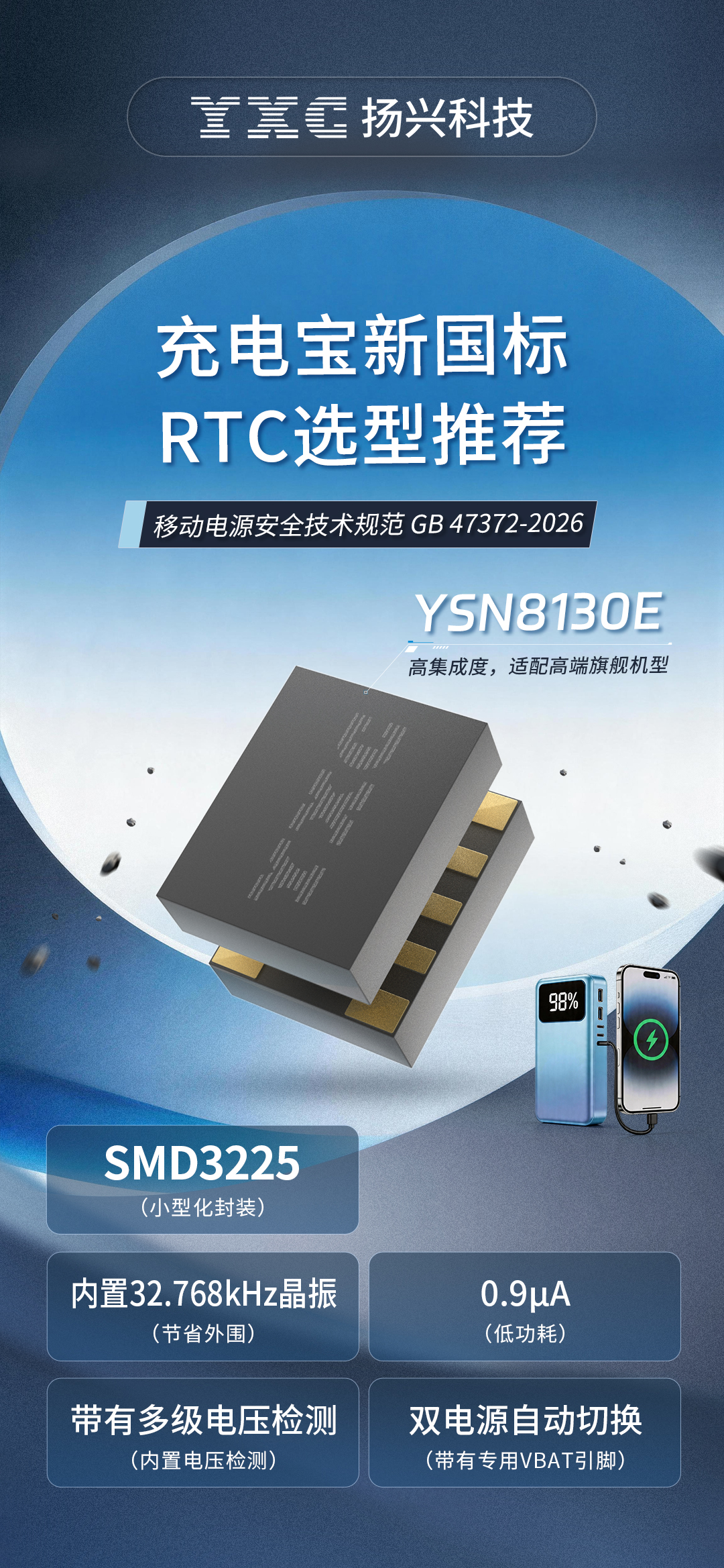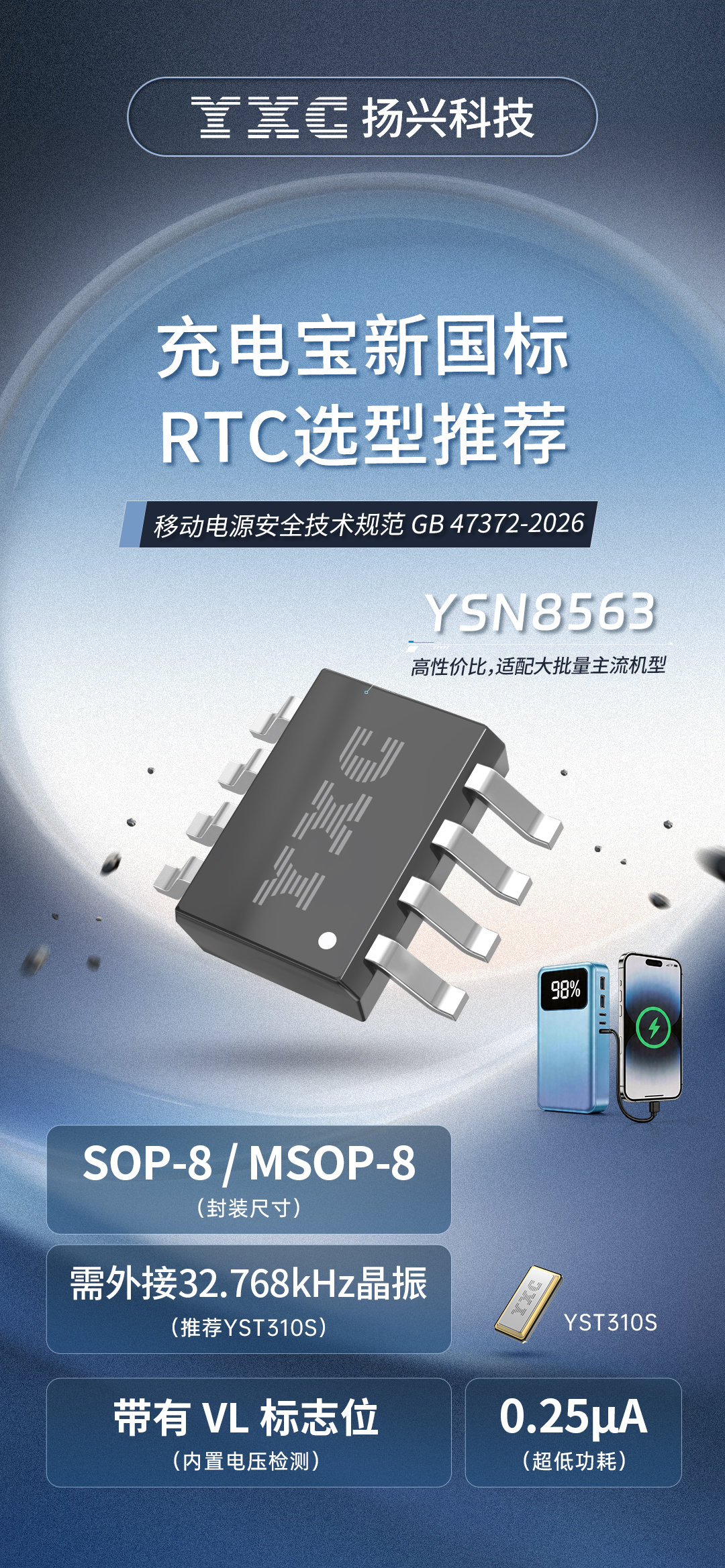 要满足新国标三项RTC相关强制要求,要么外接一颗独立低功耗的RTC芯片,要么使用MCU内部RTC搭配备用电源。由于充电宝主控选型多样,导致通用型内部RTC难以兼顾高精度与低功耗,因此,需依赖一颗独立的专用RTC芯片,从根本上解决精度与功耗的双重痛点。外挂YXC扬兴科技YSN8563系列RTC是实现充电宝新国标合规最简单、最可靠、成本最优的解决方案。