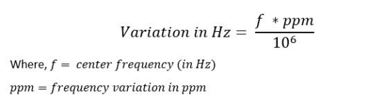 例如 - 如果晶振的输出频率为 1 MHz (1000000 Hz),并且频率稳定性为 5 ppm,则其频率将变化 5 Hz。