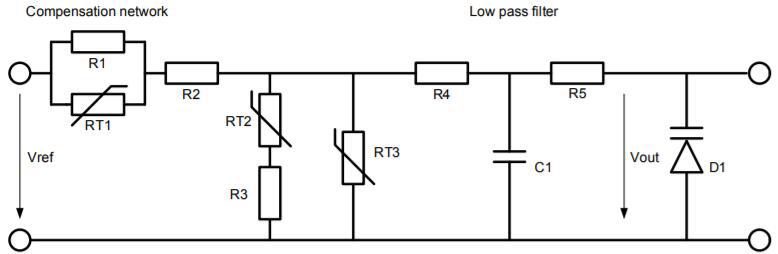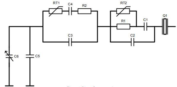 是由热敏电阻和阻容元件组成的温度补偿电路, 在振荡器中与石英晶体振子串联而成的。 在温度变化时, 热敏电阻的阻值和晶体等效串联电容容值相应变化, 从而抵消或削减振荡频率的温度漂移。 该补偿方式电路简单, 成本较低, 节省印制电路板(PCB) 尺寸和空间, 适用于小型和低压小电流场合。 但当要求晶体振荡器精度小于±1ppm 时, 直接补偿方式并不适宜。