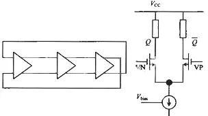 反相器型VCO的核心是由奇数个反相器组成,振荡频率由每个反相器的延时以及反相器的个数决定的。每个单元的延时时间与流过反相器的电流、电压、工艺有关。这种结构的VCXO优点是电路设计简单,振荡频率可以被设计得很高,但是它对电源或地的噪声比较敏感,相位抖动较大。