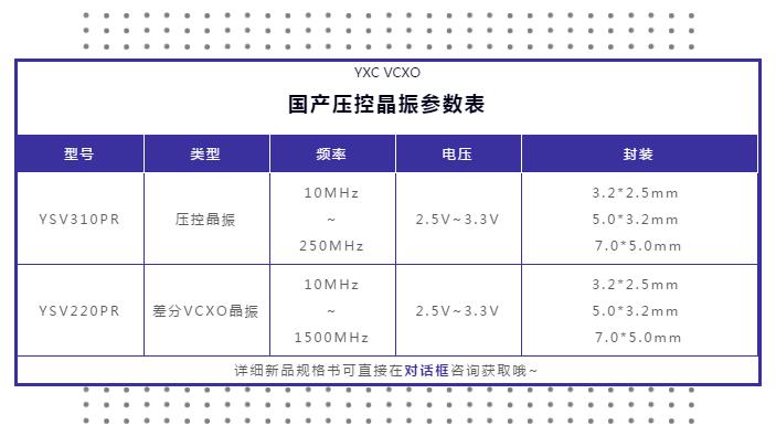 扬兴下半年全新推出2款国产压控晶振,频率稳定度均为±50ppm,超高频可达1500mhz,快速出样,无需长交期即可满足客户开发需求。