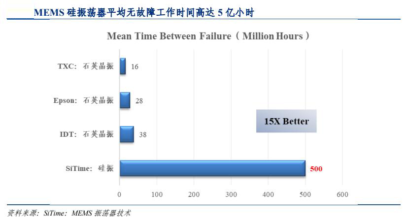 石英晶振不同的工作频率对应不同的切割角度和切割方式,小型化后质量稳定性难以保障。此外,石英晶振老化后,可能导致密封在金属壳与基座空腔内的惰性气体“漏气”。一旦晶体表面的银被氧化,产品将出现故障。石英产品平均无故障工作时间仅为 3 千万小时。而硅 MEMS 晶振生产时采用完全半导体工艺,保证了量产产品的品质一致性;且硅晶振采用先进工艺进行真空密封,无“气密性”问题。SiTime 晶振公司测试数据显示,硅晶振平均无故障工作时间可高达 5 亿小时。