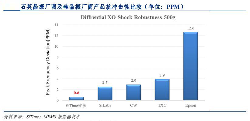 石英晶振工作频率与晶片厚度成反比,晶片太薄则容易碎裂。工作频率为 40MHz 的石英晶振,对应晶片厚度仅为 0.04mm。因此,高频石英产品在运输过程中容易碎裂。而 MEMS硅晶振轻巧的设计和先进的架构,使其具有良好的抗冲击能力。根据 SiTime晶振 公司测试报告显示,硅晶振抗冲击性是石英晶振 10 倍以上。