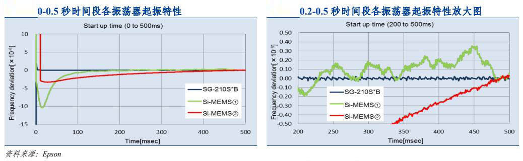 根据 Epson 晶振对 0-0.5 秒时间段中,在 3.3V 电源电压、+25℃的条件下各振荡器通电后的起振特性的测试结果:以频率偏差在±10*10-6 以内的稳定所用时间进行比较,石英晶体振器的振荡频率在 1.5 毫秒以内实现稳定;全硅 MEMS 振荡器①约需 90 毫秒;受频率补偿方式的影响,相位抖动特性较好的全硅 MEMS 振荡器②约需 250 毫秒。