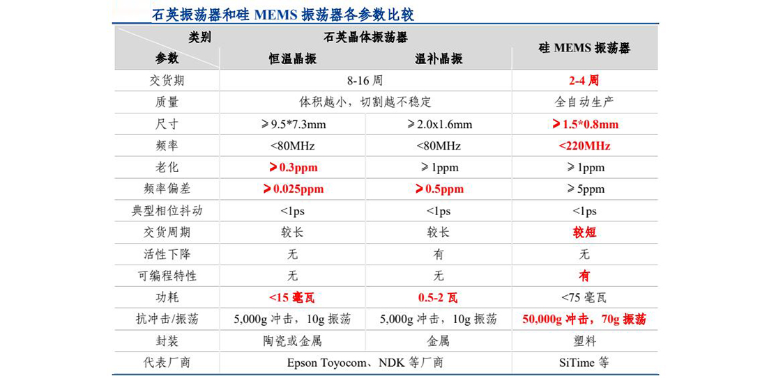 石英生产流程包括切割、镀银、封装、测试、老化等数十道工序,一般需要经过 8-16 周的生产周期。此外,石英振荡器所需的基座和起振 IC 全部被两三家日系供应商控制,这决定了石英晶振无应急供货能力。而 MEMS 硅晶振加工厂会提前备有大量的 MEMS 谐振晶片及 CMOS 晶片,当有客户需求的时候仅需要进行简单的封装测试就可交货,交货周期大大缩短。