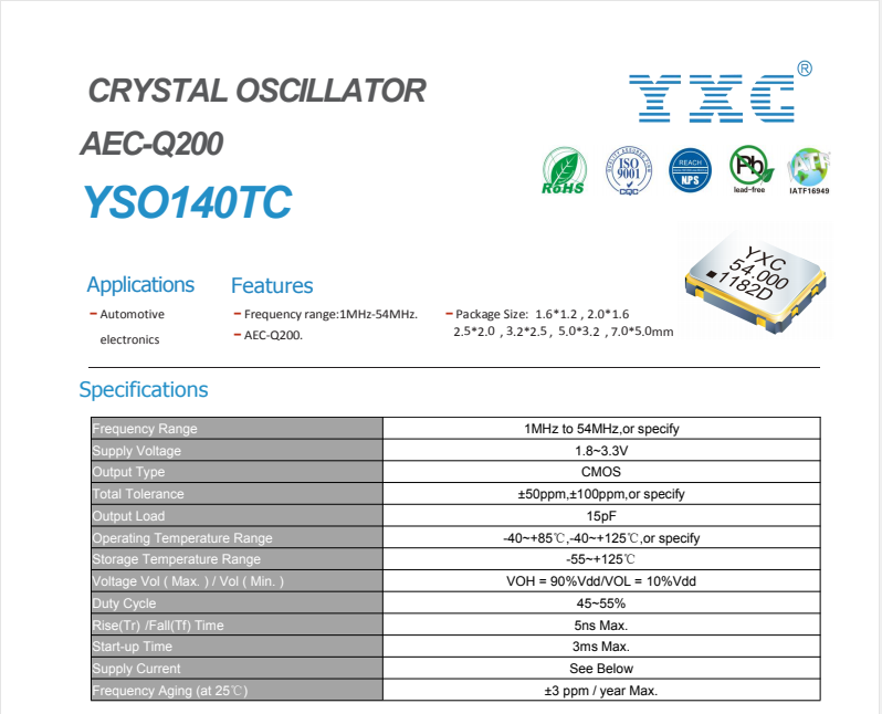 ②YSO140TC,车规级振荡器,频率范围1-54MHZ,多种封装尺寸1612-7050,可兼容多个电压1.8-3.3V,温度达到-40~+125°,通过AEC-Q200、IATF16494认证。