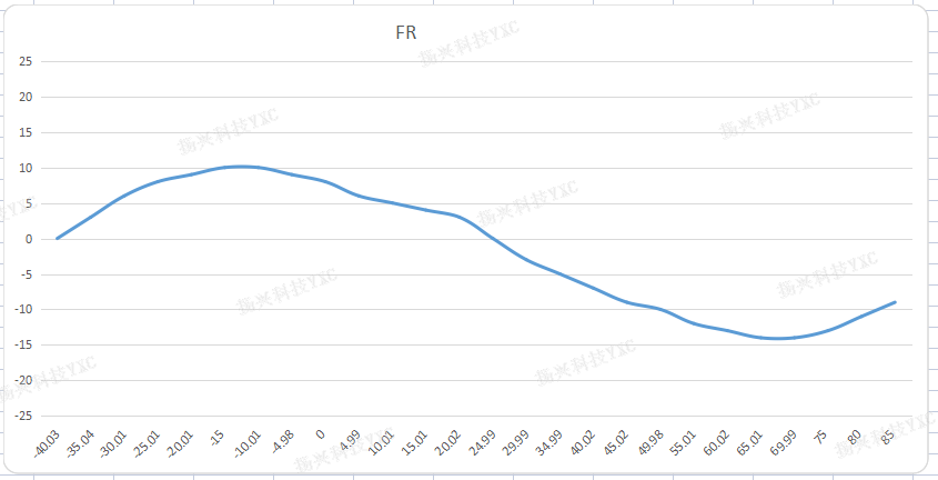 以 25C时晶振的频率为基准,随着温度的降低,输出频率将先提高,再降低;随着温度的升高,输出频率将先降低,再升高。本例中,55C时的晶振输出频率相对常温最多可能降低12ppm。