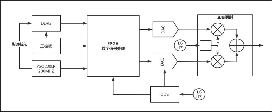 随着FPGA器件的快速发展,其高速大容量可编程的特点使其得到广泛应用,对多模多制式的设计需求需要选用FPGA进行设计,它主要完成数字信号处理工作。另外,由于TD-LTE、FDD-LTE的高数据量高速的要求,需要DDR2作为多模信号或用户数据的存储介质。在基带信号发生后,还需要将其DAC转换后用宽带正交调制器调制到各自载波上发射。另外,多模多制式信号的发生需要不同码元速率的设计,需要选用DDS分频出高分辨率可变时钟。所以该设计选用“DDR2+FPGA+DAC+DDS+宽带调制器”硬件架构。