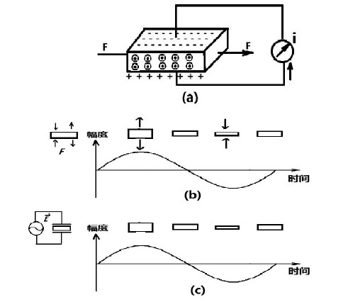 石英晶体的压电效用图:(a) 压电效应(b) 正压电效应(c) 逆压电效应
