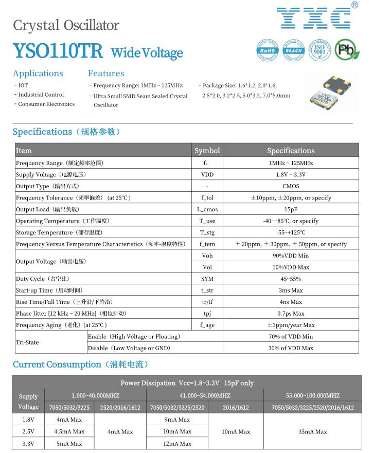 3、以下为YXC扬兴科技有源晶振YSO110TR系列规格书及结构。