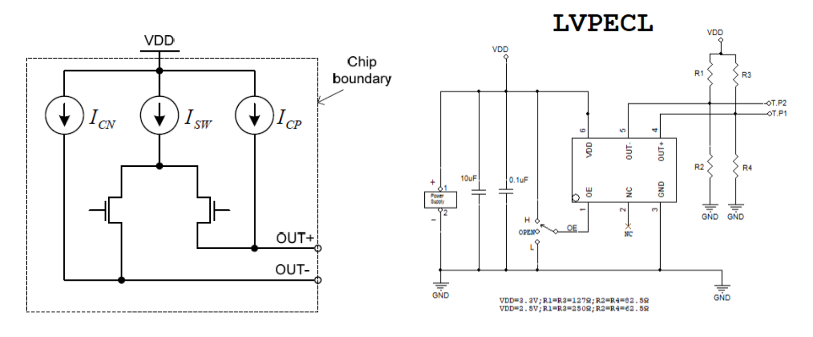 1、LVPECL模式:LVPECL(Low Voltage Positive Emitter-Couple Logic)是主要的差分输出之一。它通过避免晶体管饱和,实现更快的开关速度,并配备恒定电流源驱动器。由于大电压摆动(通常为600-1000mV),LVPECL具有卓越的抖动性能,从而输出低噪声信号,适用于PON、显卡、光模块、智能网卡等。