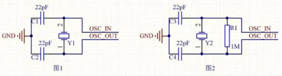 在实际的产品设计时,晶振部分的电路会有下面2种电路,图1电路中,没有1M的反馈电阻,图2电路中,晶振会并联一个1M的电阻,