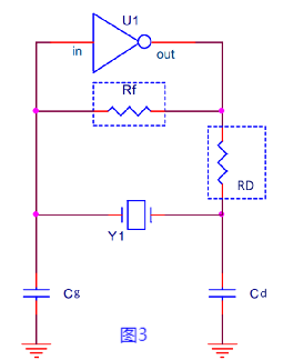 这个电阻的作用是限制IC的驱动能力,并且与Cd组成一个低通滤波器,以确保振荡器的起振点在基频上,而不是在其他高次谐波频率点上(避免3次,5次,7次谐波频率)。如果晶振的功耗超过晶振制造商的给定值,外部电阻Rd是必需的,用以避免晶振被过分驱动。如果晶振的功耗小于晶振制造商的给定值,就不推荐使用Rd,可以预设0Ω。如图3所示