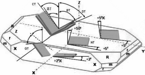 根据对石英棒切割角度的不同,有不同种类的石英板材,例如AT、BT、CT、DT、NT、GT切型板材。不同类型的石英板材,以一组欧拉角表示,具有不同的可用弹性、压电和介电性能。这是设计石英晶体器件的基本参数。最常用的石英切割类型如图3所示。