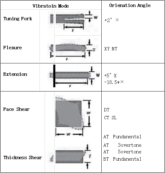 石英晶体单元的振动类型分为弯曲振动,扩张振动,表面切变振动和厚度切变振动。通常使用的振动类型和切割方式的示意图列在表1中。基频和泛音可以在任何类型的谐振器中工作。基频和泛音可以在任何类型的谐振器中工作。最常用的是基频,但对于厚度型器件也常用泛音,如图4所示。)