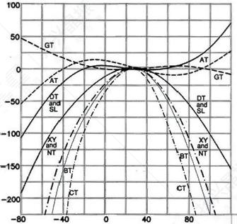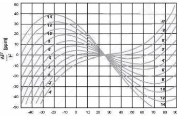 石英产品大多作为电路元件用于频率选择和/或频率控制,因此器件的频率-温度特性是最重要的参数。这种百万分之一(ppm)级频率-温度特性的稳定性是石英频率器件的另一个优点,是LCR离散分量振荡电路无法在大规模生产中实现的。对于常用的石英晶体切割,其频率-温度特性如图5所示。