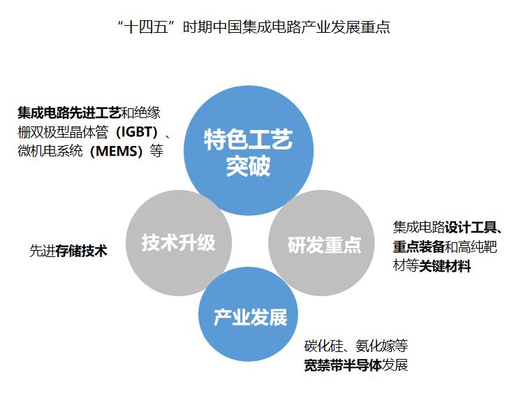 根据《“十四五”规划纲要和2035年远景目标纲要》,“十四五”期间,我国集成电路产业将围绕技术升级、工艺突破、产业发展和设备材料研发四个方面重点发展。