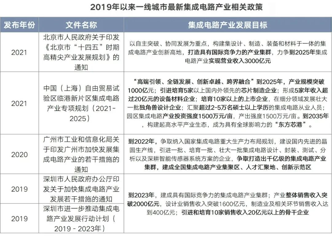 在地方层面,近年来集成电路产业发展较为集中的各地方,纷纷制定地方性发展规划和政策,在国家政策的基础上设立地方专项基金、推出重点集成电路企业培育和扶持政策,梳理总结2019年以来一线城市最新集成电路产业相关政策文件、发展目标及相关措施。