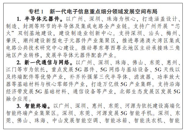 广东省人民政府 2021年8月9日印发《广东省制造业高质量发展“十四五”规划》。规划提出,以广州、深圳、珠海为核心,打造涵盖设计、制造、封测等环节的半导体及集成电路全产业链。支持广州开展“芯火冶双创基地建设,建设制造业创新中心。支持深圳、汕头、梅州、肇庆、潮州建设新型电子元器件产业集聚区,推进粤港澳大湾区集成电路公共技术研究中心建设。推动粤东粤西粤北地区主动承接珠三角地区产业转移,发展半导体元器件配套产业。