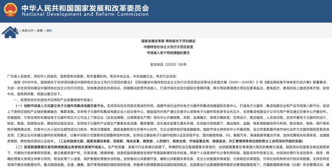 2022年1月26日,国家发改委、商务部发布《关于深圳建设中国特色社会主义先行示范区放宽市场准入若干特别措施的意见》。其中第一条就指出,要支持深圳组建市场化运作的电子元器件和集成电路国际交易中心。
