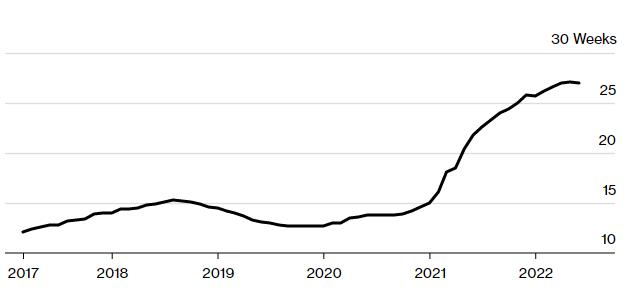根据海纳国际市场分析师的研究,交货时间是半导体订购和交付之间密切关注的主要指标 ,6月份平均交付时间为 27 周,而 5 月份为 27.1 周。 这些迹象表明供应链通胀放缓,价格上涨放缓,也可能是‘高峰交货时间’。