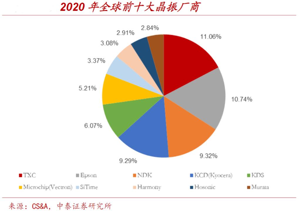 本土厂商崛起,高端晶振国产替代突破。日本是石英晶振传统制造强国,2010年起台湾厂商凭借产量优势崛起,大陆厂商以低成本占据中低端市场,国内中高端产品依赖进口。目前,全球石英晶振厂商主要集中在日本、美国、中国台湾及大陆,根据CS&A数据,2020年台湾晶技以11.06%市占率位列第一,日本厂商Epson(10.74%)、NDK(9.32%)、KCD(9.29%)、KDS(6.07%)分列二至五位,合计占比35.42%。本土厂商正在突破高端产品壁垒,实现国产替代,技术方面,光刻工艺是高端晶振关键壁垒,需要光刻机等高端设备支持。