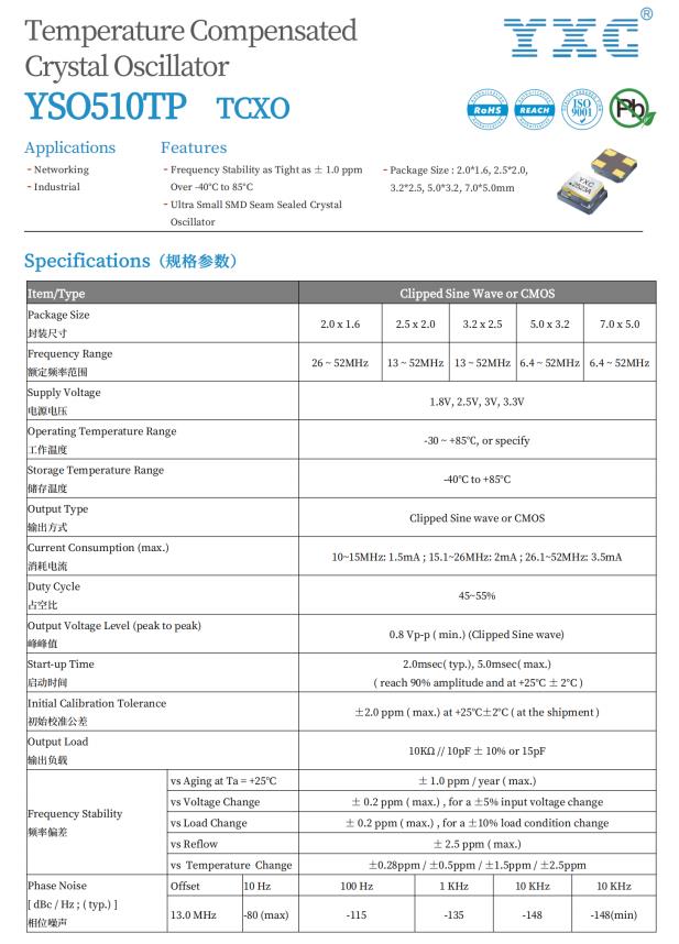 YXC TCXO温补晶振YSO510TP系列特点如下: