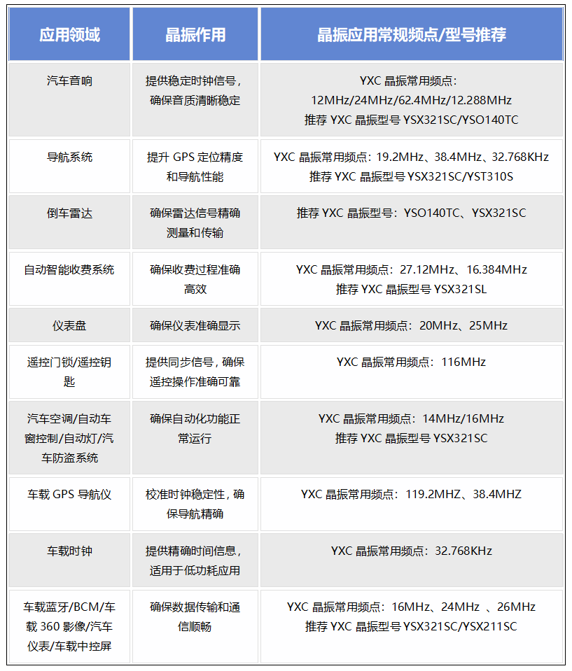 请注意,表格是一个简化的示例,实际应用中可能还有更多细节和特定的应用案例。晶振的具体型号和规格也会根据应用需求而有所不同,可咨询小扬获取产品规格书及选型建议。
