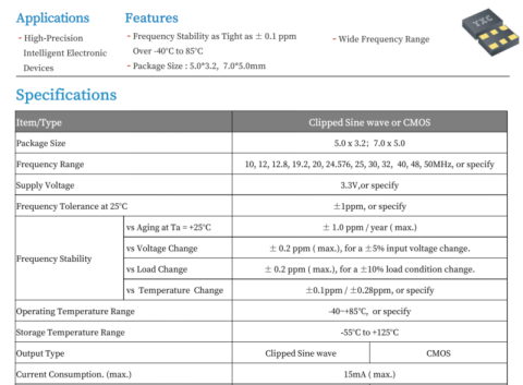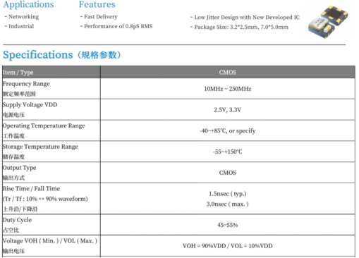 YSO510TP为通用系列TCXO。可选频率范围为10~52MHz、尺寸最小可达2.0 x 1.6mm、具备CMOS与Clipped sine wave两种输出方式。在-30~85℃的工作温度范围内,温度稳定性(典型值±2.5PPM,最小值±0.28PPM)。以下为产品实测数据: