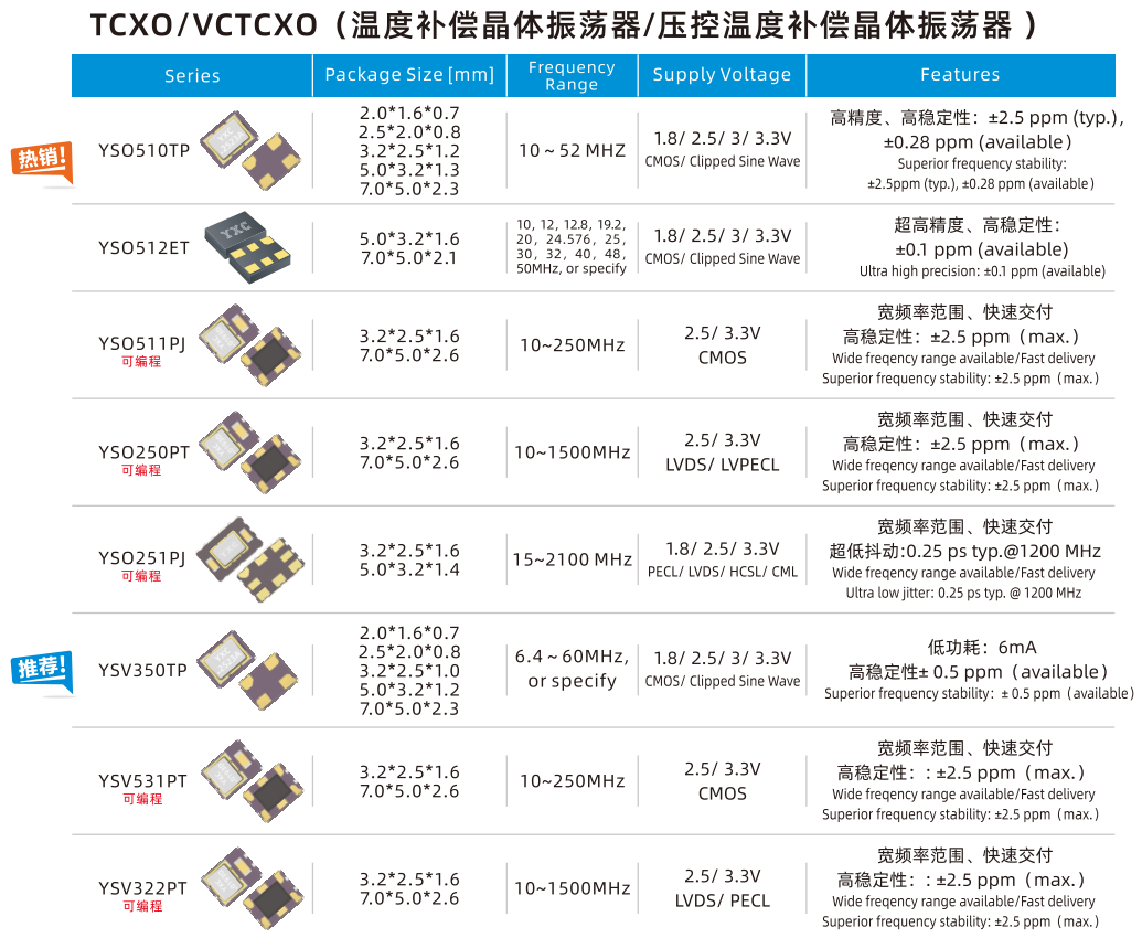 如果需要同时具备温度补偿和电压控制功能的晶体振荡器,建议选择压控温度补偿晶体振荡器(VCTCXO),如YSV350TP、YSV531PT等。
