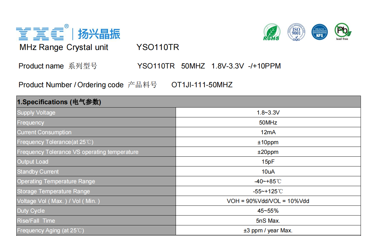 让我们来看看石英振荡器YSO110TR的产品信息。该产品型号为OT1JI-111-50M,频率为50MHz,具有总频差±30PPM的高精度特性。采用5032 4P封装,该系列产品可提供多种尺寸的封装选项,包括1612-7050等,满足不同BMS设计的需求。其工作温度范围为-40℃至85℃,适应严苛的环境变化,确保在各种工作条件下的可靠性。