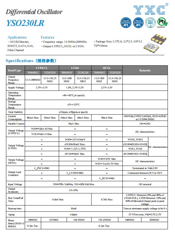 推荐使用YXC热销差分晶振YSO230LR系列,该系列的特点及优势如下: