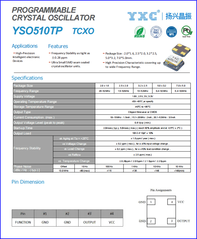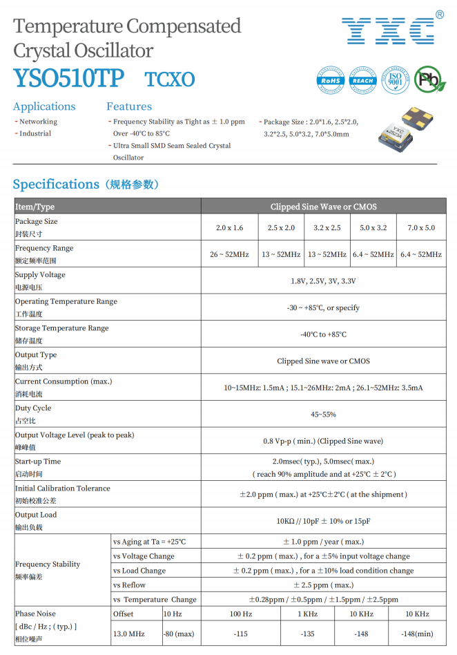 YSO510TP温补晶振(TCXO)的产品特点及优势: