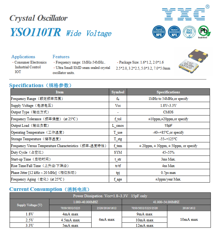 YSO110TR系列宽电压有源晶振是YXC扬兴科技专为刷卡器等应用设备设计的优质解决方案。该晶振系列具有以下特点: