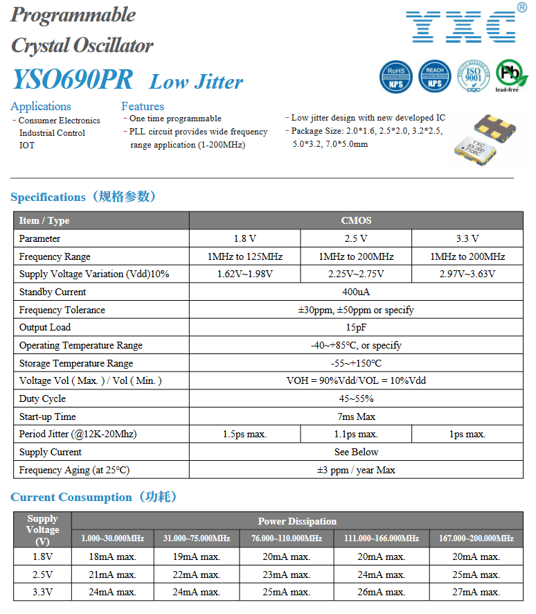 QMEMS振荡器YSO690PR具备以下出色特点: