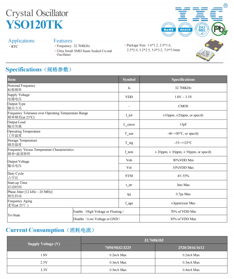YSO120TK是一款32.768kHz石英晶体振荡器,其高精度和稳定性在通信系统中发挥着重要作用。在-40~﹢85℃的工业级宽温范围内,YSO120TK的频率稳定度仅为±30PPM,确保了通信系统在各种复杂环境下都能提供高可靠的时钟信号,从而保障车载互联的稳定连接。