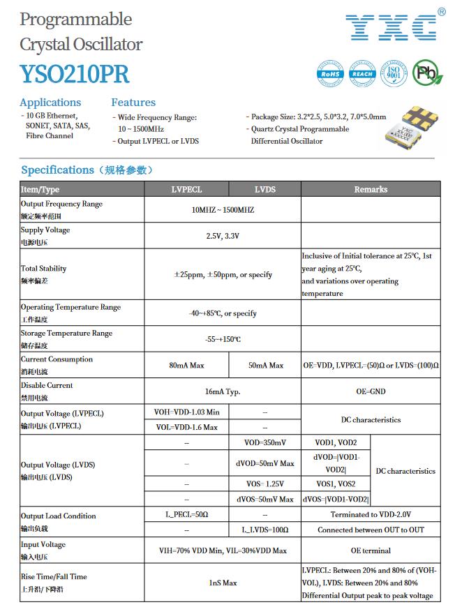 系列,频率为10~1500MHz,封装尺寸多种可选:3.2x2.5/5.0x3.2/7.0x5.0,以下为YSO210PR系列规格书。