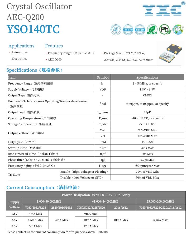 YXC晶振YSO140TC系列,频率为1~54MHz,工作温度-40~+125℃,封装尺寸多种可选:1.6 x 1.2/2.0 x 1.6/2.5 x 2.0/3.2 x 2.5/5.0 x 3.2/7.0 x 5.0,以下为YSO140TC系列规格书。