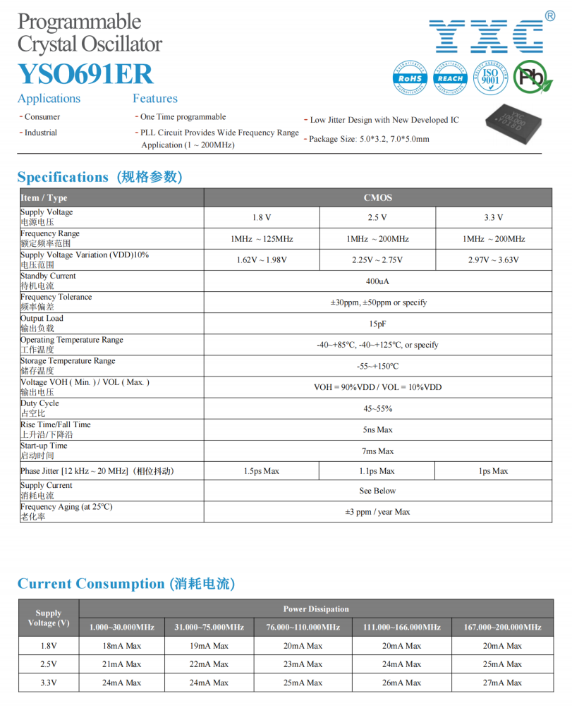 1、石英可编程晶振,任意频点可做,精确至小数点后六位,国内技术领先,为系统提供精准的参考时钟;YXC晶振YSO691ER系列,频率为7.3728MHz,总频差±50PPM,以下为YSO691ER系列规格书。