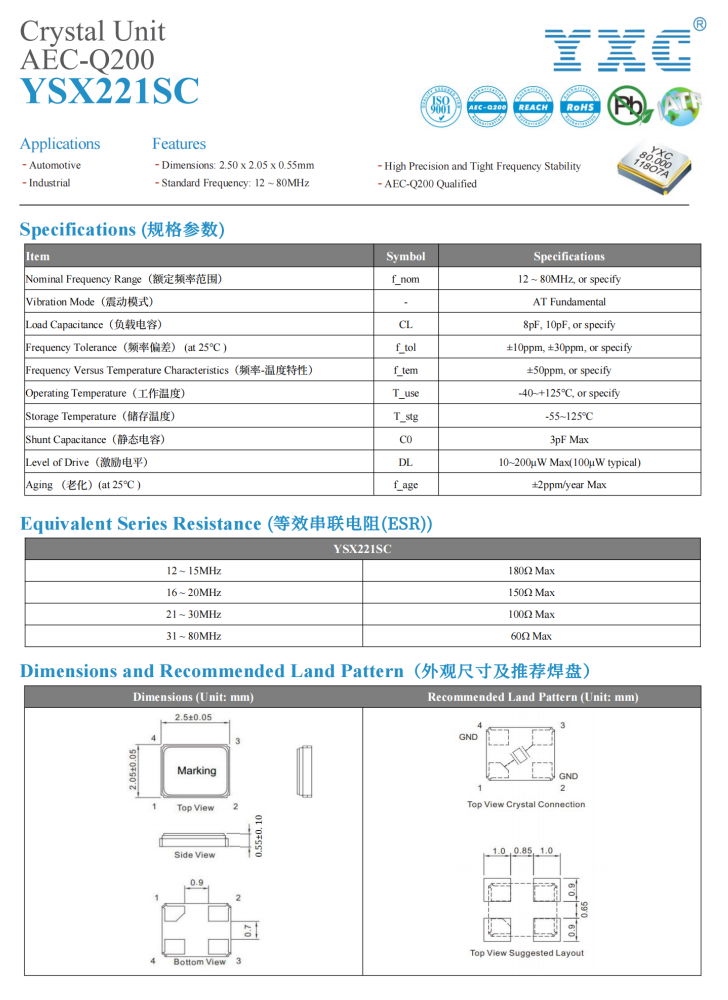 YXC晶振YSX221SC系列,频率为16.384MHz,工作温度-40~125℃,以下为YSX221SC系列规格书。