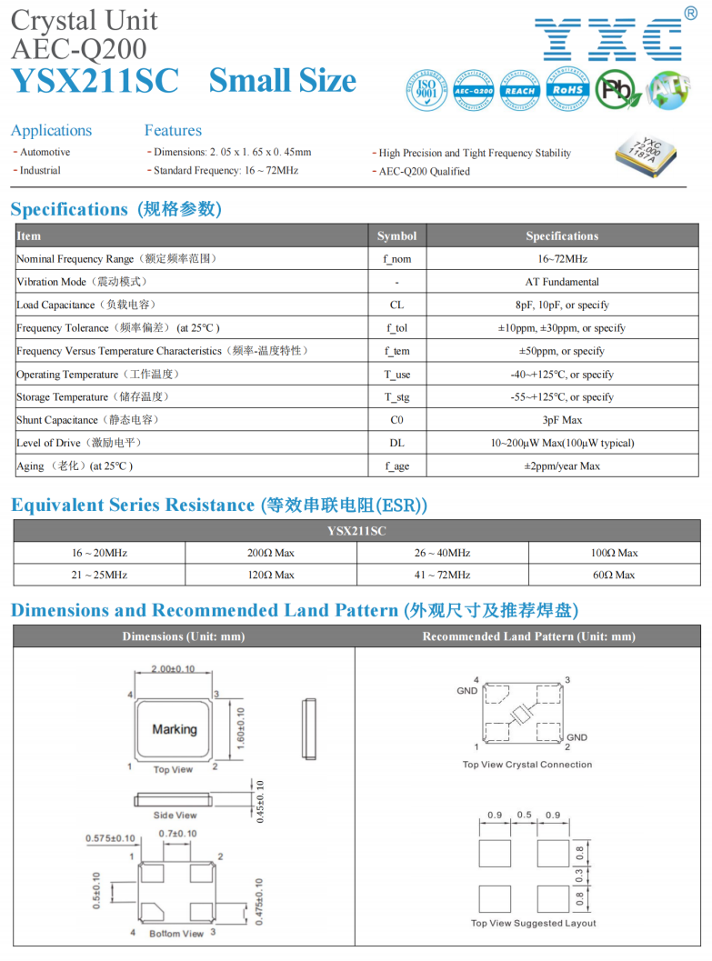 YXC车规谐振器YSX211SC,标称频率50MHZ,搭配8PF负载电容,常温频偏±10PPM,工作温度-40~125℃ ,以下为YSX211SC系列规格书。