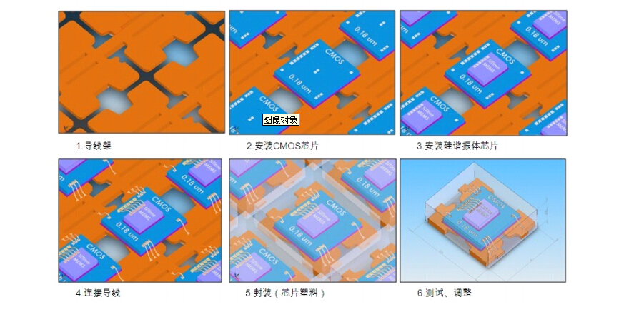 上面六幅图揭示了整个SITIME晶振生产工艺流程,SITIME MEMS振荡器采用上下两个晶圆叠加的方式,外部用 IC 通用的塑料做为封装。不仅大大减少的石英晶振的工序,而且更全面提升了产品性能。