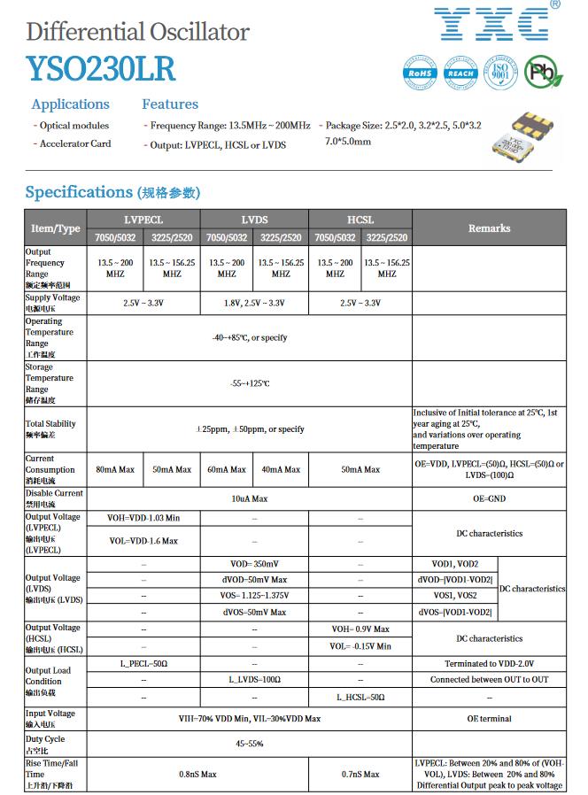系列,频率为13.5~200MHz,多种输出方式:LVPECL/ LVDS/HCSL,以下为YSO230LR系列规格书。
