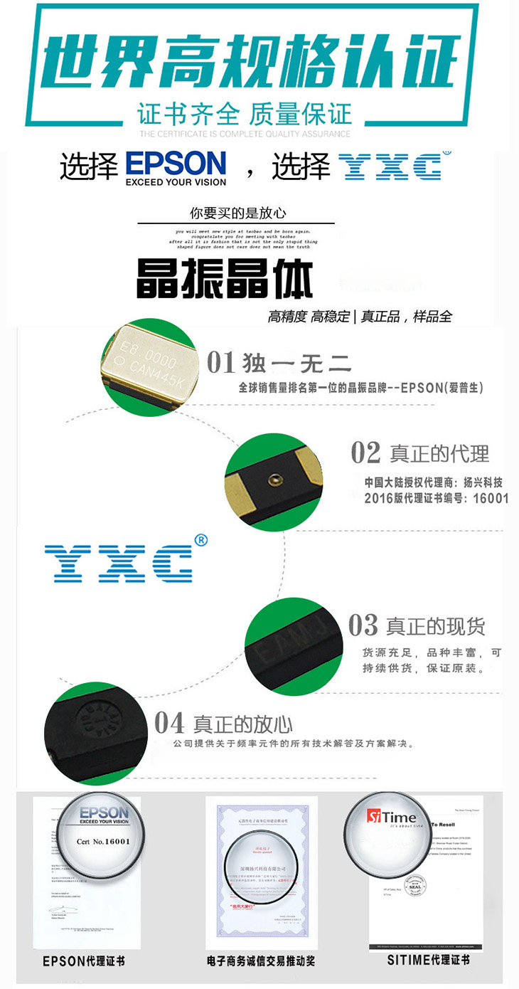 1、如何保证原厂正品?扬兴科技有进出口权和原厂代理资质,所销售的所有EPSON晶振均为直接报关进口,没有任何中间环节,可以保证原厂正品,也能节约交付时间;