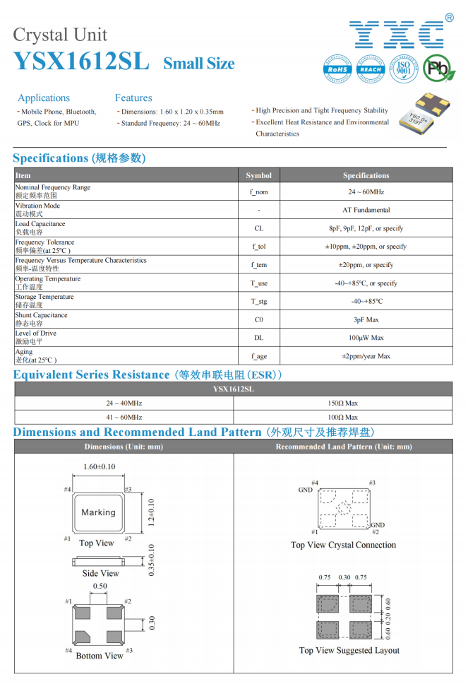 那么,在有限的空间电路板里扬兴推荐尺寸2016和1612的贴片晶振,具有小型化,高精度,低功耗,低老化特点;常见频率有:16MHZ、24MHZ、24.576MHZ、26MHZ、32MHZ、40MHZ;